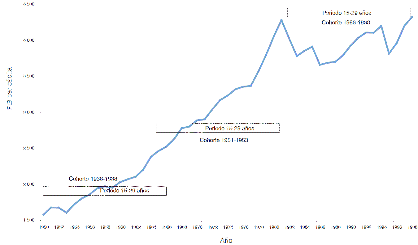 Grafica 1 PIB per capita nacional y cohortes de la Encuesta Demografica Retrospectiva Nacional (Eder)cuando tenían 15 a 29 años de Edad