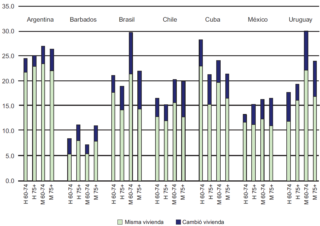 Es interesante que a simple vista no exista en la región una tendencia sistemática a modificar el arreglo residencial de acuerdo con la edad del adulto mayor, al menos en los dos grupos de edad aquí considerados. Es decir, las magnitudes de los porcentajes en la mayoría de los países no varían considerablemente de acuerdo con la edad. Las excepciones más notables se presentan entre las mujeres brasileñas, uruguayas y cubanas, donde las menos envejecidas se mueven considerablemente más que sus similares mayores. Lo mismo ocurre con los hombres cubanos de 60 a 74 años, cuya proporción de cambio residencial es 7% mayor que la de sus símiles de 75 años y más.