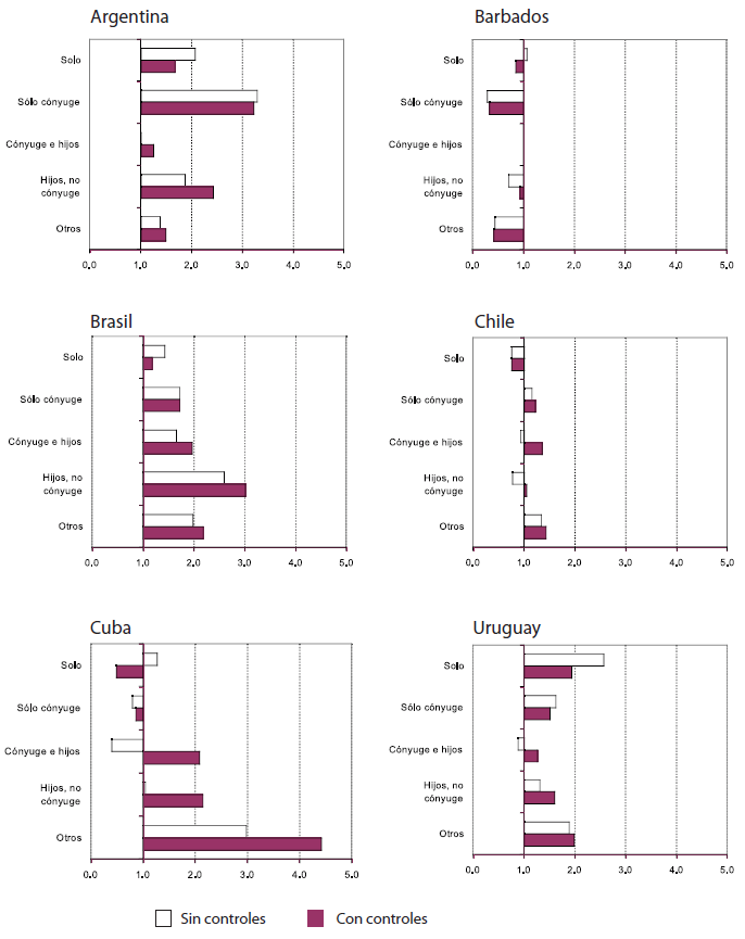 Las proporciones de adultos mayores que modificaron su arreglo residencial en los cinco años previos a la encuesta en cada una de las ciudades consideradas se presentan en el cuadro 1. Los datos muestran que alrededor de uno de cada cinco adultos mayores en Latinoamérica cambió de arreglo residencial durante los cinco años previos a la encuesta. Se advierten importantes diferencias dentro de la región. En Argentina poco más de la cuarta parte de la población de 60 años y más cambió su estructura familiar, mientras en Barbados únicamente nueve de cada 100 adultos mayores lo hicieron. Cuba, Uruguay y Brasil presentan proporciones cercanas a 25%, mientras Chile y México tienen magnitudes del 18.9 y 15.4%, respectivamente.