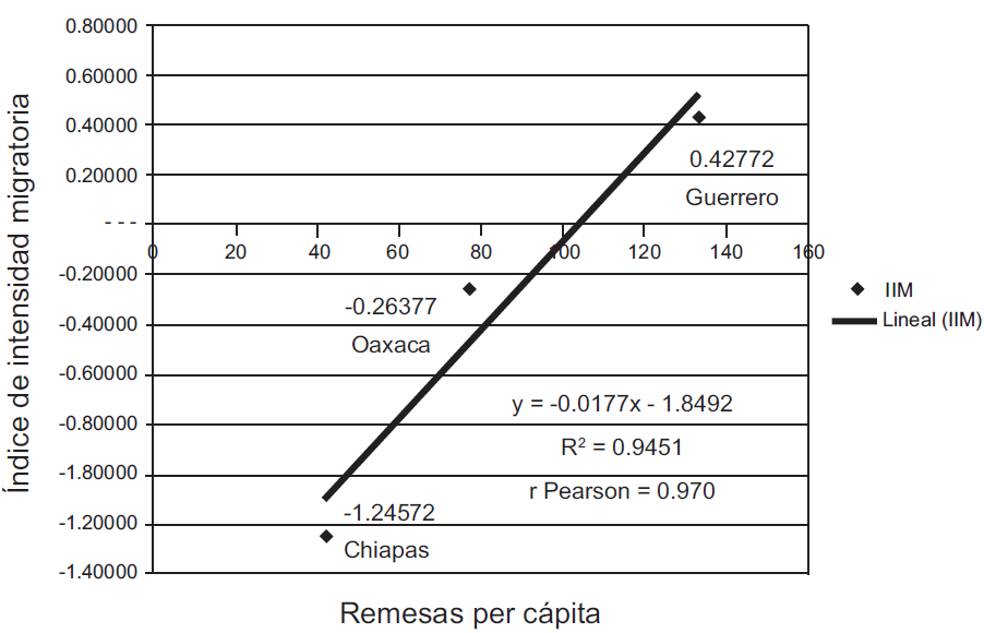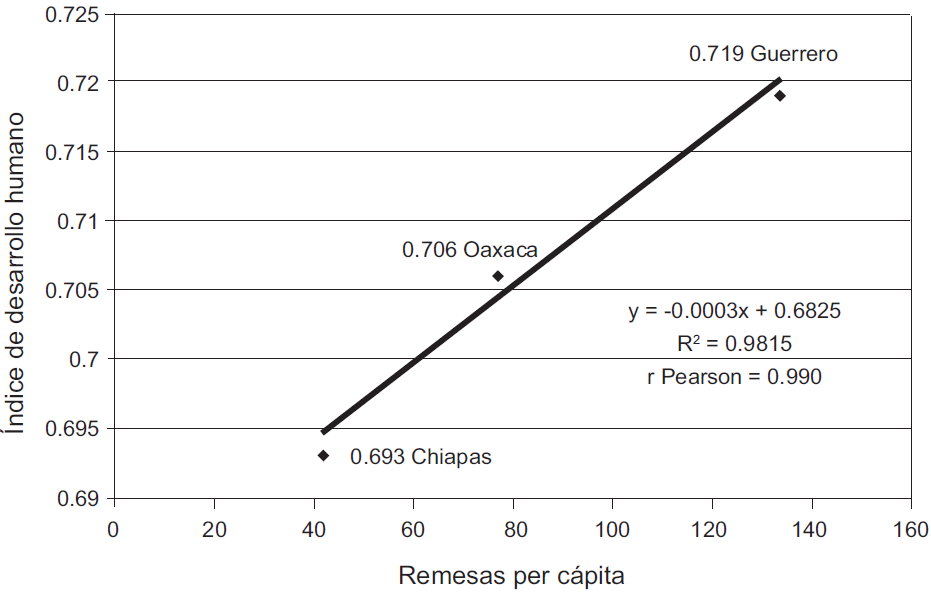 Al calcular el coeficiente de correlación (r de Pearson) entre IDH y las remesas per cápita de esta región (véase la gráfica 2) se ve que dicho coeficiente es igual a 0.990, de ahí que se presente una correlación significativa, lo cual quiere decir que los valores de cada una de las variables fluctúan correlativamente: al aumentar uno, aumenta el otro. Es decir, cuando se incrementa el porcentaje de la población receptora de remesas, aumenta el índice de desarrollo humano (IDH). Los resultados confirman la hipótesis de que en regiones de reciente incorporación al fenómeno migratorio donde se presenta una mayor población receptora de remesas -aportaciones de los flujos de dinero enviados por los migrantes mexicanos en el extranjero a las regiones-, los índices de desarrollo humano mejoran.