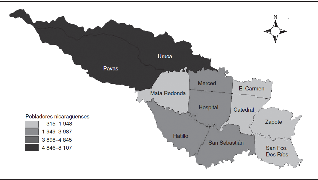 La población nicaragüense asentada en el CCSJ se concentra en los distritos Uruca, Pavas, Merced, Hospital, Hatillo y San Sebastián, como lo muestra el mapa 2.