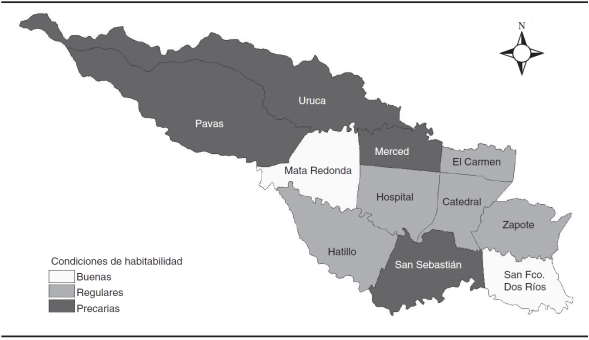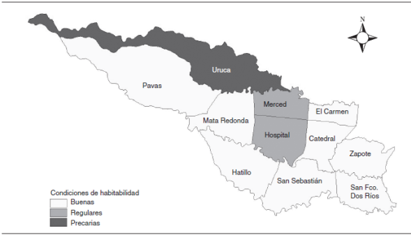 Los datos del censo del año 2000 dan cuenta de que las y los pobladores de los distritos del este del CCSJ (Pavas y Uruca) presentan mayores carencias en sus condiciones de habitabilidad (ocupación del suelo, calidad de la vivienda y acceso a servicios básicos). En situación intermedia se encuentran las y los habitantes de los distritos centrales Merced y Hospital, y la población de los restantes siete distritos (Mata Redonda, Hatillo, San Sebastián, Zapote, San Francisco de Dos Ríos, Catedral y El Carmen) goza de las mejores condiciones de habitabilidad (véase el mapa 1).19