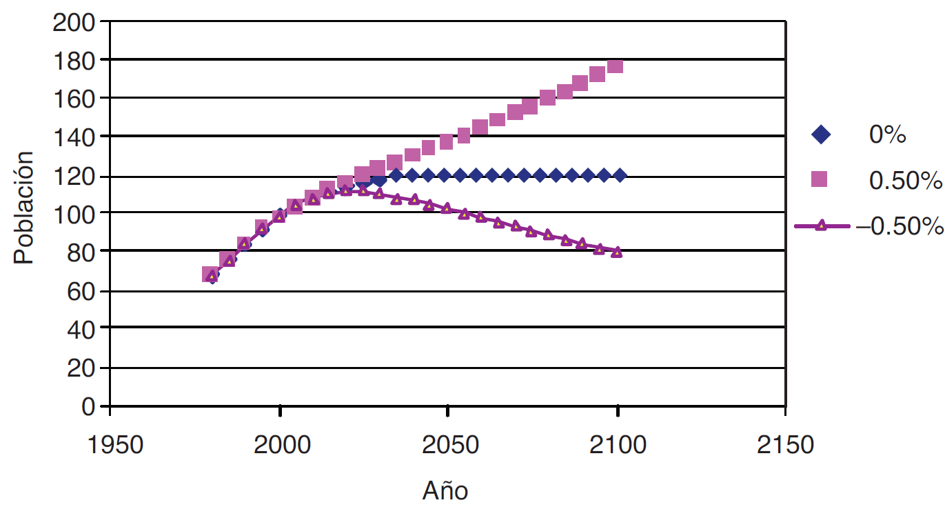 En conclusión, un rango en la tasa de crecimiento demográfico entre -0.5 y 0.5% anual, que parecería ser pequeño, produce grandes diferencias en el número de habitantes que habría en 2100, que va de 80 millones según la hipótesis de k 1 = -0.5% a 176 millones en el supuesto de k 1 = 0.5%, es decir, una variación de 1% anual en la tasa de crecimiento demográfico produce una diferencia de 100 millones en 2100.
