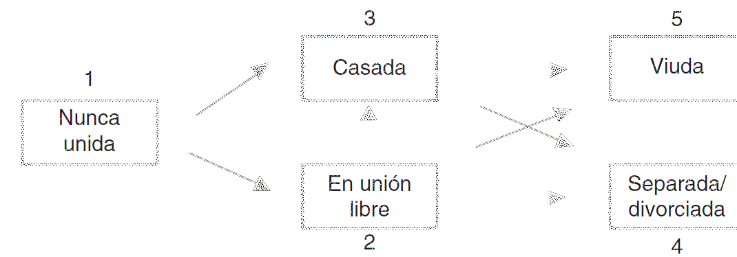 En el esquema 1 se muestra el diagrama de los estados en la formación y disolución de las uniones. El modelo de estados múltiples fue diseñado de la siguiente manera: Todas las mujeres empiezan en el estado 1 nunca unida; a partir de éste tienen tres posibilidades: (I) permanecer en el estado inicial, (II) transitar al estado 2 en unión consensual, o (III) pasar al estado 3 casada. las que transitan al estado 2 cuentan con cuatro opciones: (I) quedarse en este estado, (II) transitar al estado 3, es decir, legalizar la unión consensual, (III) transitar al estado 4 separada o divorciada, o (Iv) pasar al estado 5 viuda. Estos dos últimos estados se consideran terminales o de absorción. Una vez en el estado 3, las mujeres tienen tres posibilidades: (I) permanecer casadas, (II) transitar al estado 4, o (III) pasar al estado 5. Es evidente que no todas transitarán a todos los estados, no sólo por la intensidad de cada uno de ellos, también porque debido al instrumento de captación, la historia de vida de las mujeres queda truncada en el momento de la encuesta. Pero, siendo el caso, al pasar por los distintos estados las mujeres contribuyen con años-persona vividos y están expuestas al riesgo de ocurrencia de las transiciones correspondientes a cada estado.
