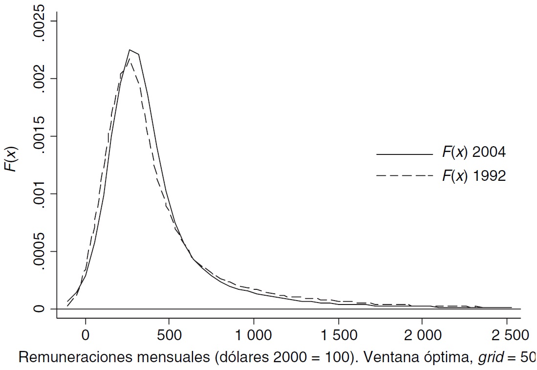 En la gráfica 1 se muestran las estimaciones de las densidades empíricas de las remuneraciones de los trabajadores en su conjunto entre 1992 y 2004. Puede parecer que los cambios distribucionales no han sido relevantes, sin embargo se aprecia que la distribución ha sufrido un desplazamiento hacia la derecha, específicamente en la parte que se halla apenas por encima de la media total de las remuneraciones entre ambos años (511 y 525 dólares respectivamente), y se observa que la moda de la distribución es más pronunciada en 2004, como señal de un aumento en los ingresos en esa proporción de la población.
