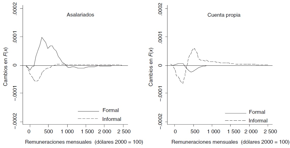El comportamiento de cambio entre ambos tipos de posición laboral es inverso en relación con el sector, es decir, muestra cambios positivos para los asalariados formales y también para los que trabajan por cuenta propia pero son informales, y en esta última categoría laboral los cambios se asemejan más a los operados en la gráfica 5 de las funciones de densidad de la distribución total.