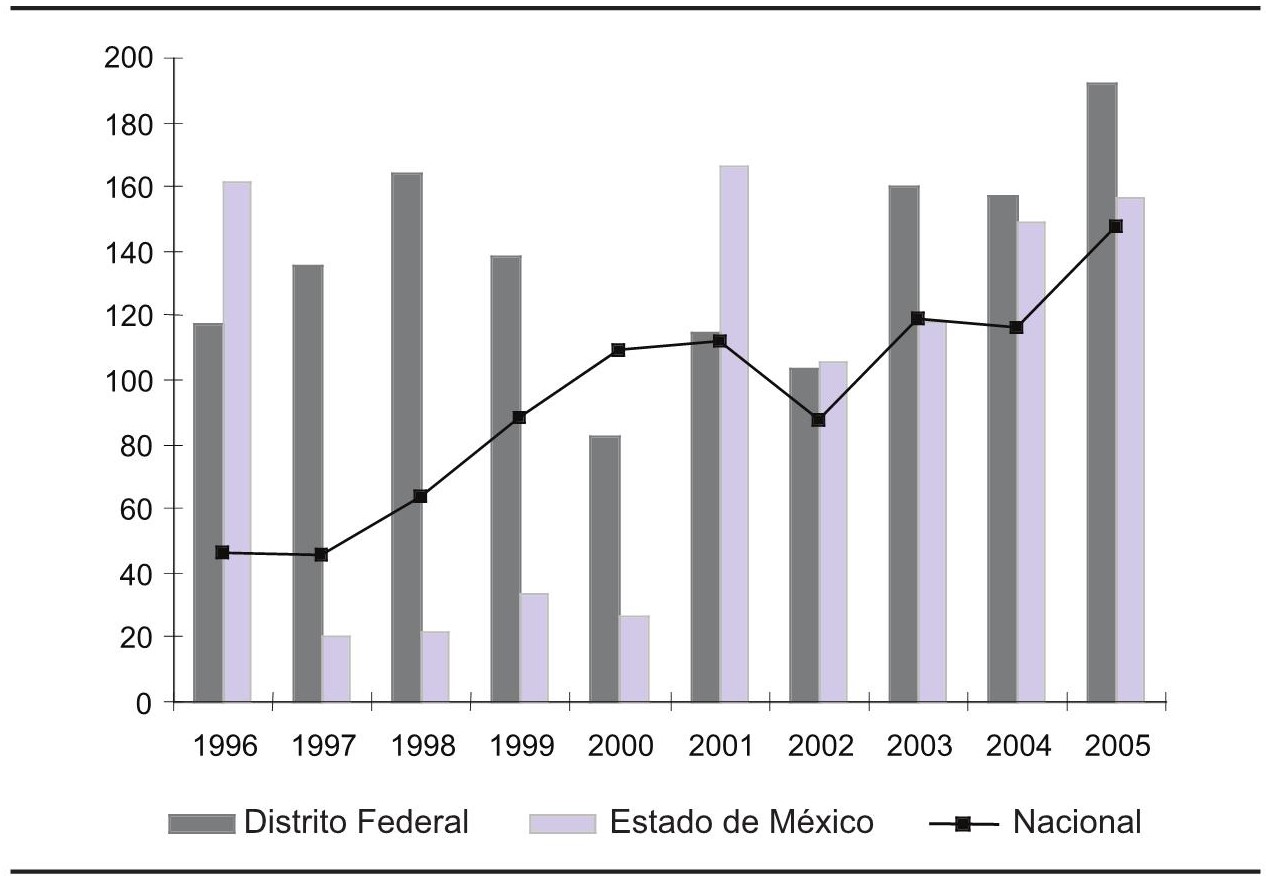 Al agregar la información de la inversión promedio (por beneficiario) asignada en número de salarios mínimos, a fin de presentar un indicador ponderado más riguroso que muestre las tendencias deflactadas, se aprecia un comportamiento diferenciado entre las entidades y el conjunto nacional (gráfica 1). En primer lugar destaca el predominio del Distrito Federal ya que, con excepción del año 2000, supera al nacional en la asignación crediticia para vivienda. En contraste el Estado de México se mantuvo muy por debajo del nacional durante los años 1997-2000, aunque a partir del año 2001 experimentó un crecimiento sin precedente y una tendencia constante a partir de 2002, al igual que el Distrito Federal. El cálculo del agregado por periodo (1996-2000 y 2001-2005) es un incremento de 14% de la asignación crediticia en el Distrito Federal; 64% en el Estado de México y 65% en el nacional. En síntesis, es evidente que el Estado de México experimenta la mayor expansión del financiamiento a la vivienda.