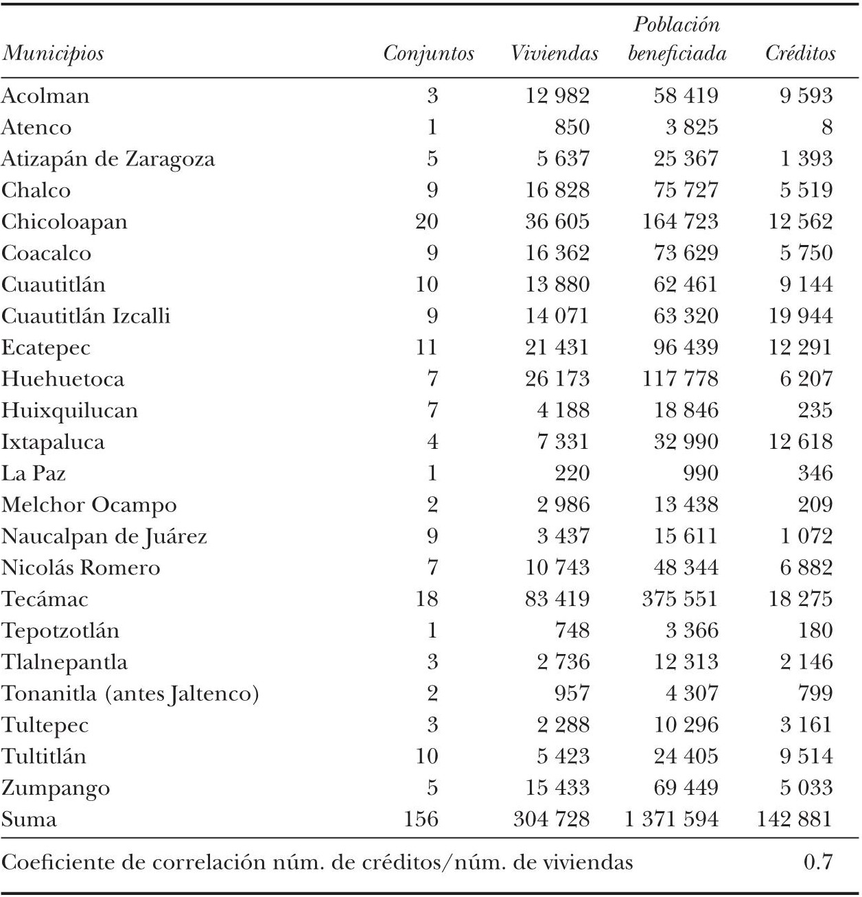 De los 23 municipios sede de estos fraccionamientos, sólo Tecámac y Chicoloapan concentran casi 25% de la construcción inmobiliaria y 40% de las viviendas construidas por los desarrolladores en los municipios conurbados del Estado de México. En Acolman, Huehuetoca, Zumpango y Tecámac se encuentran los complejos habitacionales más grandes; los tres primeros se ubican en el cuarto contorno metropolitano. Huehuetoca tiene el mismo número de conjuntos que Nicolás Romero y Huixquilucan, pero supera notablemente la cantidad de viviendas y la población beneficiada. En Naucalpan se construyen nueve conjuntos de pequeña escala (en promedio 400 viviendas). Es evidente que la ubicación de los complejos habitacionales más grandes está en la periferia más lejana de la ciudad y se construyen siguiendo la disponibilidad de tierra en municipios de amplia superficie, con lo que marcan la pauta de un patrón de movilidad residencial intensa, pero con bajos niveles de urbanización, toda vez que se convierten en núcleos relativamente aislados.
