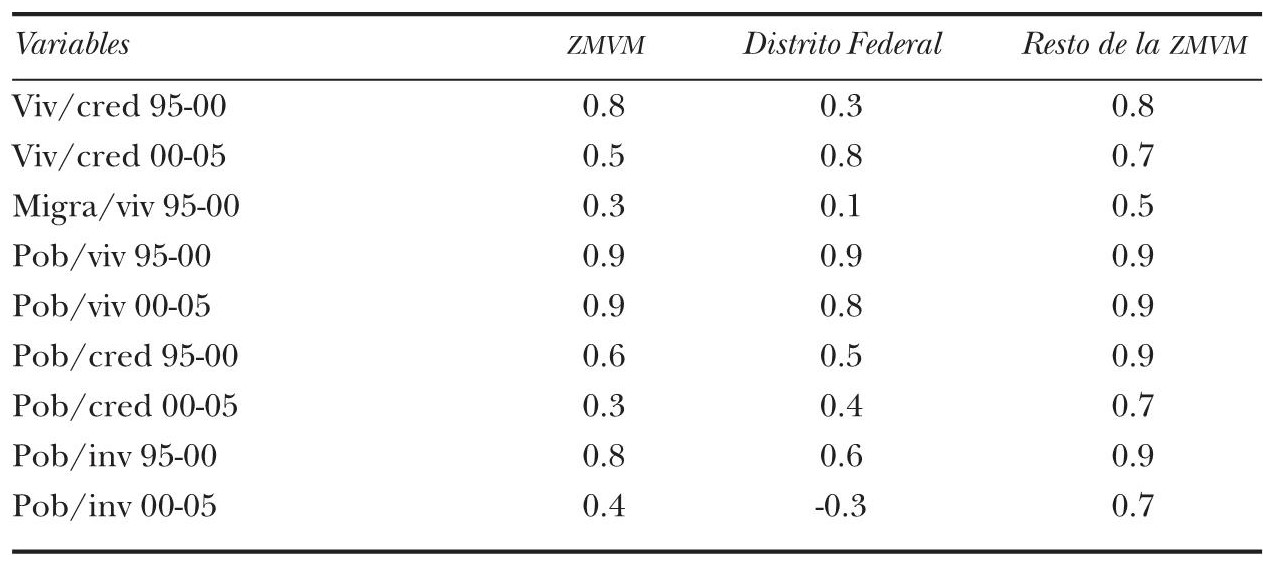 En el anexo 2 se concentran las variables que sustentan las correlaciones a partir de las cuales se pretende un análisis más integral. Se intenta homologar los periodos censales para las variables de población y vivienda con la Muestra censal que arroja datos sólo para el periodo 1995-2000, así como la información proveniente de la Conavi sobre el financiamiento. Con el afán de obtener un análisis de conjunto y vincular las variables de población y vivienda con los saldos migratorios y el financiamiento, se estableció un sistema de correlaciones, para lo cual se calculó la serie completa de las 74 jurisdicciones que componen la ZMVM, ejercicio cuyo resultado se presenta en el cuadro 2, en donde destacan varios aspectos: