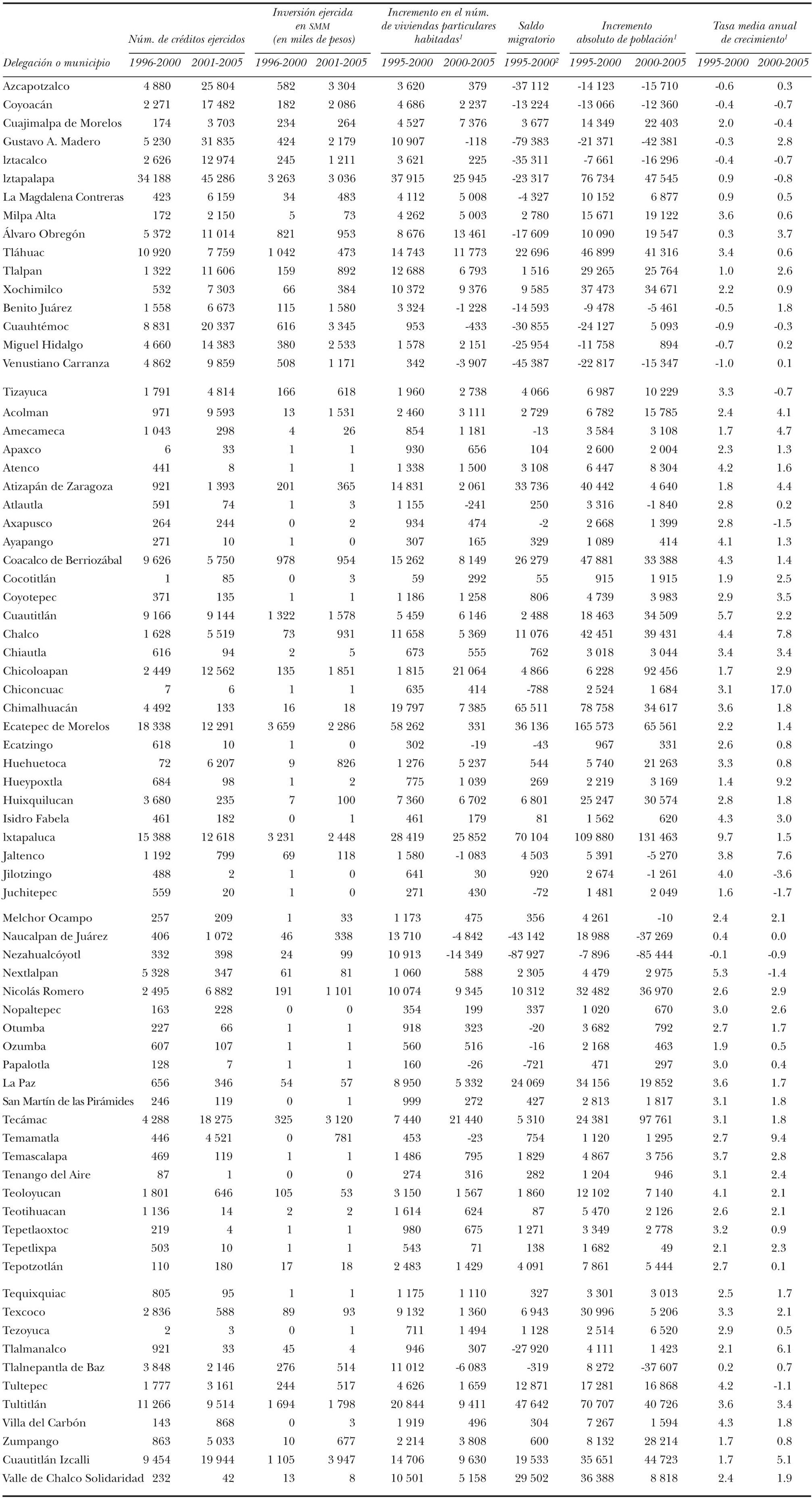 Primero, el peso del financiamiento sobre el incremento de la vivienda particular habitada en el primer periodo (1995-2000) resultó significativo para el conjunto metropolitano, no así para el Distrito Federal, lo que denota un impacto diferenciado de la política de financiamiento, ya que ésa es la etapa en que el Distrito Federal, en especial las delegaciones centrales, empiezan a expulsar población. En el segundo periodo (2000-2005) se incrementan los créditos y los programas de densificación urbana en las delegaciones centrales (Bando Dos) y se experimenta el mayor impacto del financiamiento en el Distrito Federal, pues en las delegaciones ubicadas en el sur como Tláhuac, Milpa Alta y Cuajimalpa los procesos de expansión demográfica muestran altas tasas de crecimiento (anexo 2).