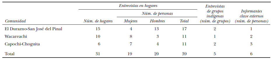 Las entrevistas se realizaron en un total de 31 hogares en los tres sitios de estudio: 15 en el pueblo de El Durazno-San José del Pinal, 10 en Wacareachi, y 6 en Capochi-Choguita. Inicialmente pretendíamos realizar el mismo número de entrevistas en cada uno de los sitios, pero por razones de acceso la muestra tuvo que reducirse en Capochi y por lo tanto se añadió un conjunto adicional de hogares en El Durazno-San José del Pinal, que se visitó al final del trabajo de campo (véase el cuadro 1).