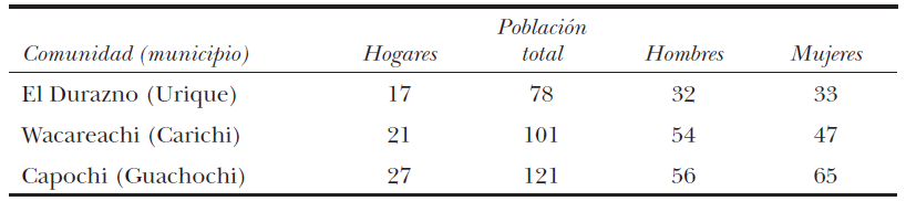 Las tres comunidades son pequeñas: en cada una habitan alrededor de 100 habitantes integrados en menos de 30 hogares. Cuando se realizó la investigación de campo, El Durazno era la comunidad más pequeña de las tres estudiadas, tanto en términos de cantidad de hogares como de pobladores, seguida por Wacareachi y luego por Capochi, la más grande (cuadro 3).