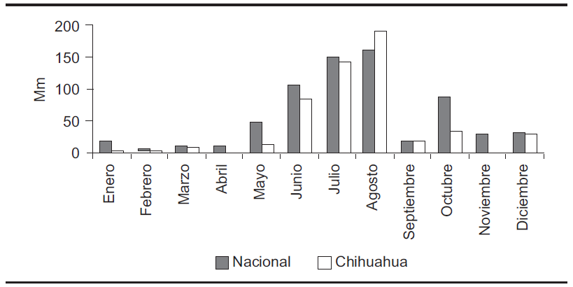Éste es un estado muy seco: la tercera parte de su territorio corresponde al área conocida como “Desierto de Chihuahua”; si bien la Sierra Tarahumara escapa del clima extremo del desierto y conforma un área que tradicionalmente capta lluvia, con cierta periodicidad sufre periodos de sequía que se han acrecentado por la deforestación de sus bosques. Las bases de datos históricas del Sistema Meteorológico Nacional (SMN) que presentan la precipitación media anual por estados de la República Mexicana ocurrida durante el periodo de 1941 a 2005 colocan a Chihuahua en el quinto lugar entre los estados que captan menos cantidad de lluvia. En diciembre del año 2006, cuando se ejecutó el trabajo de campo en que se basa este estudio, las fuentes hemerográficas referían un largo periodo de sequía de 10 años que apenas se había interrumpido en el verano anterior (32). Nuevamente los datos del SMN para 2006 reportan que en ese año Chihuahua tuvo los registros más bajos de precipitación entre las 32 entidades federativas del país, especialmente de enero a mayo, con lo cual se vieron seriamente afectadas las posibilidades de siembra de temporal en la sierra. En el mes de agosto se dio una excepción notable con fuertes lluvias torrenciales que colocaron los registros del estado por encima de la precipitación nacional (véase la gráfica 1).