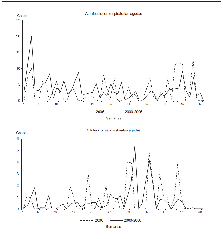 Al revisar los datos estadísticos pronto resultó evidente que coincidía la versión de los informantes de los distintos sectores entrevistados respecto a la temporada en que se registran más casos de enfermedades respiratorias agudas. Los entrevistados relataron experiencias en que los meses más fríos del invierno representaban el mayor riesgo para contraer enfermedades respiratorias (véase la parte A de la gráfica 3; nótese que la grafica se basa en el registro de datos semanales de 2006).