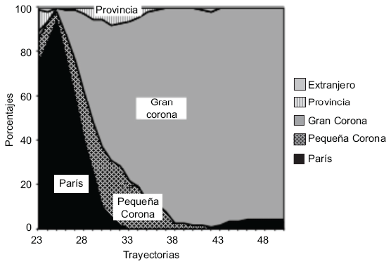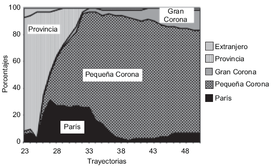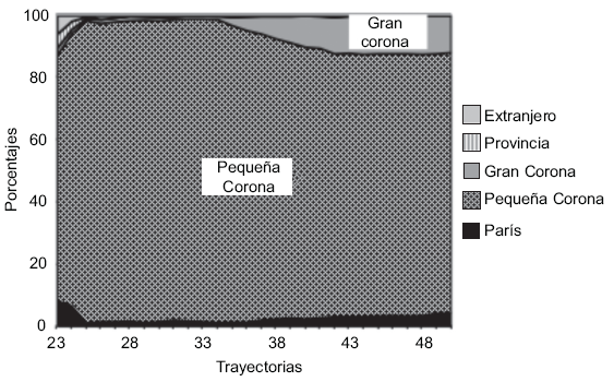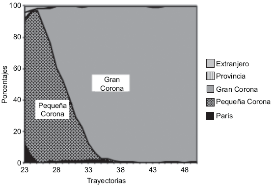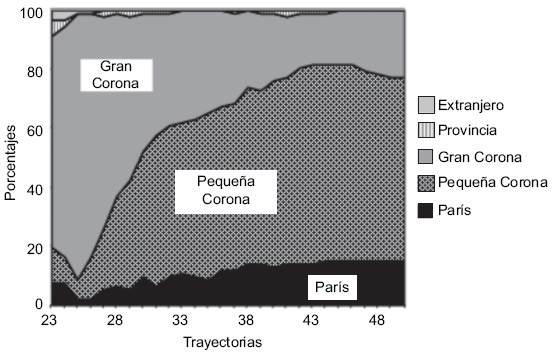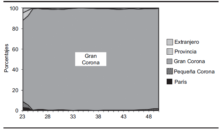 Lectura: A los 23 años, alrededor de 80% de los individuos de esta clase vive en la Gran Corona; dos años más tarde tal proporción se acerca a 100%.