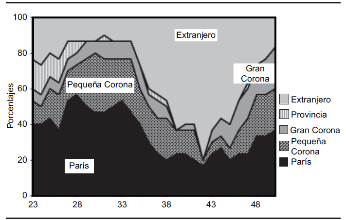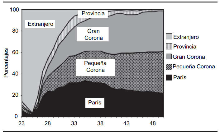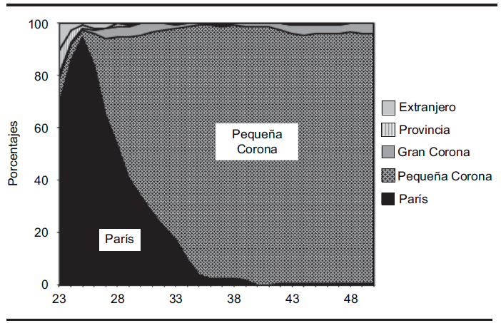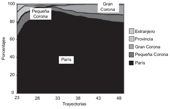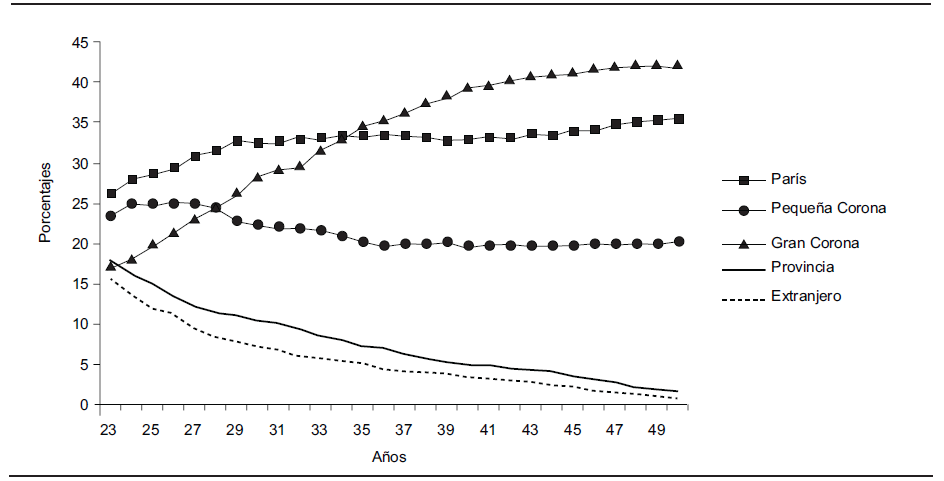 Lectura: A los 23 años alrededor de 70% de los individuos de esta clase vive en París; dos años más tarde son más de 90%; esta proporción baja en seguida de manera continua hasta los 35 años, edad en que la casi totalidad de los individuos de la clase vive en la Pequeña Corona.