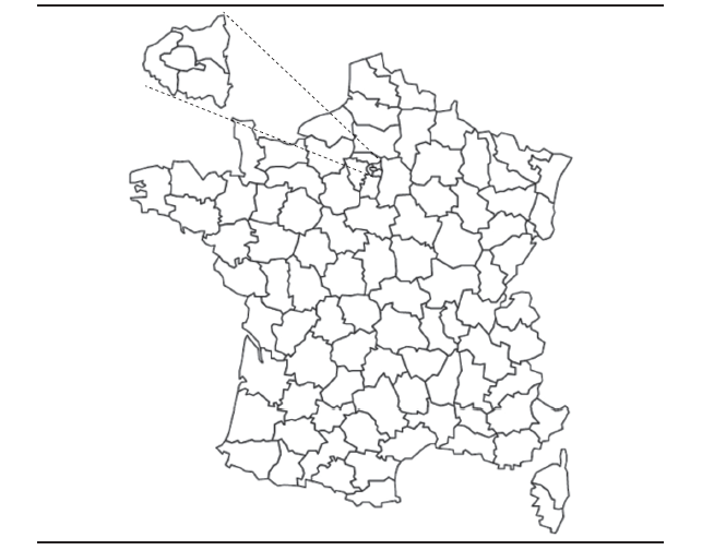 Si se calcula para los encuestados una nueva tasa de propiedad que incluya las residencias secundarias se obtiene que 75% de ellos son propietarios dentro del conjunto de encuestados de Biografías y entorno. Se observan las mismas diferencias entre generaciones: los más jóvenes son menos propietarios que los miembros de las generaciones precedentes. Con la ayuda de un modelo de regresión logística es posible caracterizar a los encuestados que poseen una residencia secundaria: se trata casi siempre de parejas que han tenido hijos, de profesionistas, propietarios de departamentos o de personas alojadas gratuitamente. Frecuentemente viven en París o en los suburbios, que comprenden los departamentos contiguos a París (véase los mapas 1 y 2). Si la nacionalidad no influye decisivamente es debido a la gran diversidad de comportamientos de los residentes que provienen de Europa y de otros continentes.
