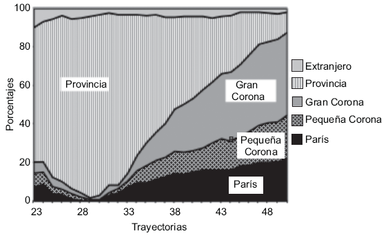 En esta parte se analizarán las transformaciones urbanas no sólo a partir de los datos de los censos, sino a partir de las trayectorias de movilidad residencial de los encuestados de Biografías y entorno. La encuesta ha recolectado el conjunto de viviendas ocupadas al menos por un año y su localización desde el nacimiento del participante hasta el momento de la encuesta. Podemos entonces seguir todas las migraciones que ha efectuado en el transcurso de su ciclo de vida y analizar la evolución del reparto de las generaciones nacidas entre 1930 y 1950 en la región parisina. Sólo 39% de los encuestados de la generación 1930-1950 presentes en Île-de-France en 2000 es franciliano de nacimiento. Los otros, originarios de la provincia (35%) o del extranjero (24%), llegaron más tarde (Beaufils y Bonvalet, 2006). La migración hacia París ha constituido pues, para la mayoría de ellos, un acontecimiento que ha marcado su trayectoria, ya sea que haya ocurrido durante su infancia o en la edad adulta. Su historia residencial presenta la particularidad de situarse en la bisagra entre dos mundos: el rural de principios del siglo XX que conocieron de niños, y el mundo global del siglo XXI al que han contribuido.