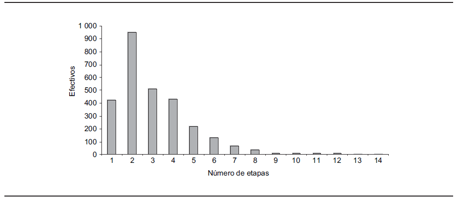 Los resultados que presentamos muestran algo bastante simple: a los 50 años los hogares encuestados han ocupado en promedio, desde su primera vivienda independiente, un número de viviendas cercano a tres y 62% son propietarios de su vivienda. El análisis de las trayectorias residenciales revela una realidad más compleja. Al considerar seis estatus posibles: propietarios, inquilinos privados, inquilinos HLM, otros estatus (viviendas gratuitas, viviendas de función social, vivienda en familia, hoteles, etc.), alojamiento en una colectividad, y viviendas transitorias,6 se obtienen 531 trayectorias posibles. Si el número de etapas, es decir el número de cambios de estatus (y no de viviendas) varía entre 1 y 14 existe una fuerte concentración alrededor de dos a tres etapas, como muestra la gráfica 3.
