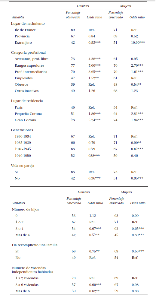 Un análisis más profundo de las trayectorias geográficas debería permitir traspasar la simple descripción al tomar en cuenta las características clásicas (categorías socioprofesionales, estado matrimonial, etc.), pero también diversas variables que resultan pertinentes luego de utilizarlas cuantitativa o cualitativamente (Bonvalet, 1998). Se trata en particular del lugar de nacimiento, de los dos últimos estatus de ocupación de la trayectoria residencial, de la posesión de una residencia secundaria y de la historia familiar del encuestado.