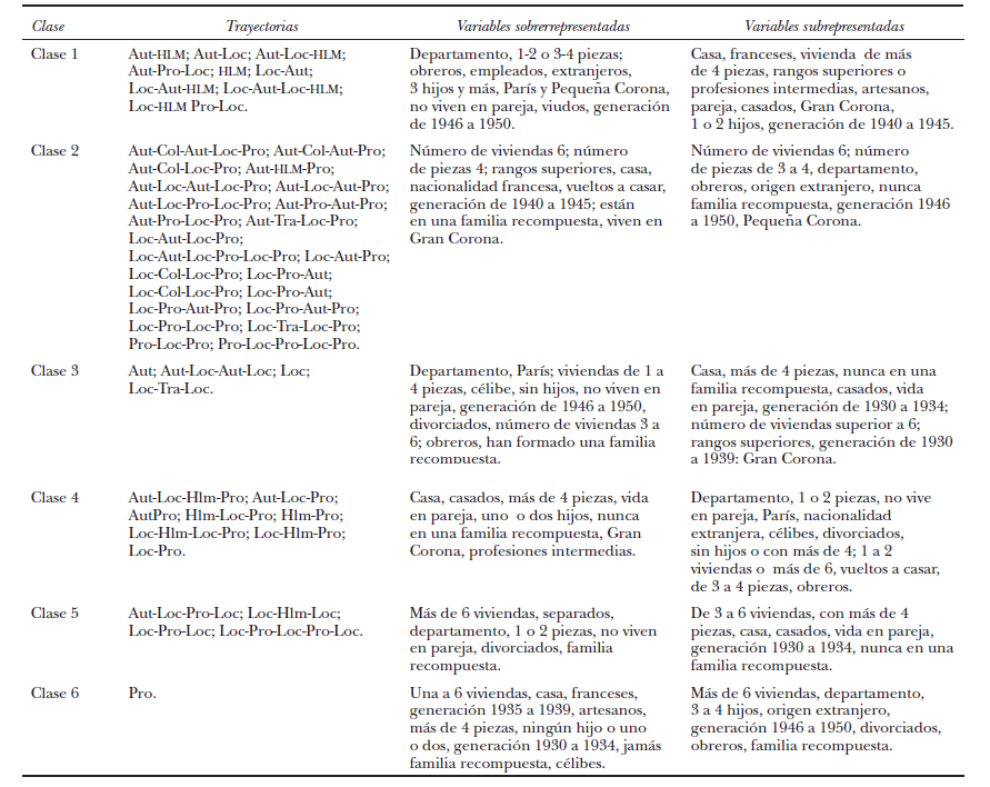 Se trata en particular del lugar de nacimiento, de la posesión de una residencia secundaria, y de la historia familiar del encuestado. Las trayectorias residenciales pueden así reagruparse en seis clases (cuadro 3) (véase Isnard y Sautory, 1994; Lebart, Morineau y Piron, 2000).7