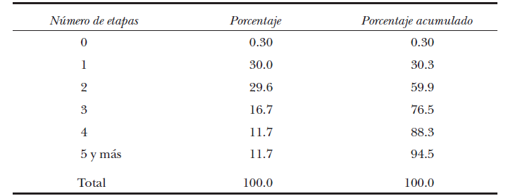 Podemos darnos una idea de estas diferencias al observar el número de etapas geográficas12 cercanas a la salida de casa (cuadro 5). Si varían entre 0 y 14 encontramos una gran estabilidad geográfica: tres cuartas partes de los encuestados han efectuado como máximo tres cambios de ubicación.