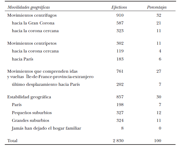 Estos resultados revelan las movilidades de las generaciones nacidas entre 1930 y 1950 en el transcurso de los últimos cuarenta años. Éstas confirman el movimiento centrífugo, sobre todo con el proceso de periurbanización, pero revelan igualmente un fenómeno de estabilidad en el interior de una misma zona geográfica. El regreso al centro se mantiene en forma minoritaria con 6% de retorno a París. Sólo queda por investigar quiénes efectúan ese recorrido y si muestran comportamientos específicos.