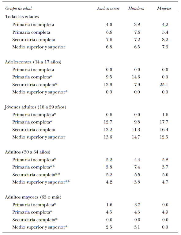 Los niveles de desocupación son más elevados para aquellos cuyo máximo nivel de instrucción es la secundaria (7.6) (cuadro 3). Entre la población de ambos sexos de jóvenes adultos se aprecia que hay mayores proporciones de desempleados en los niveles más avanzados de instrucción. Cabe suponer que los empleos, puestos u ocupaciones disponibles en el mercado laboral no van en conformidad con las expectativas de demanda de las personas que cuentan con mayor instrucción, quienes posiblemente tengan más recursos para sostener periodos más prolongados de inactividad hasta que logren encontrar un trabajo acorde a sus expectativas.