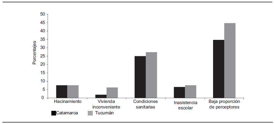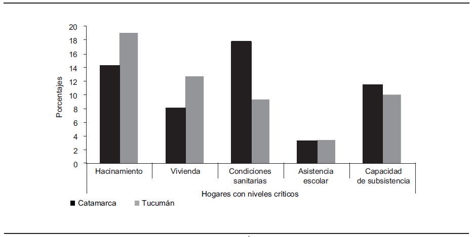 31Diez años antes, en 1991, el porcentaje de hogares con NBI era el mismo en ambas provincias (24.6%). En aquel entonces Tucumán seguía teniendo niveles más críticos de hacinamiento y viviendas inconvenientes, mientras que la situación de los hogares catamarqueños era peor en relación con las condiciones sanitarias inadecuadas (Osatinsky, 2011: 248-249).