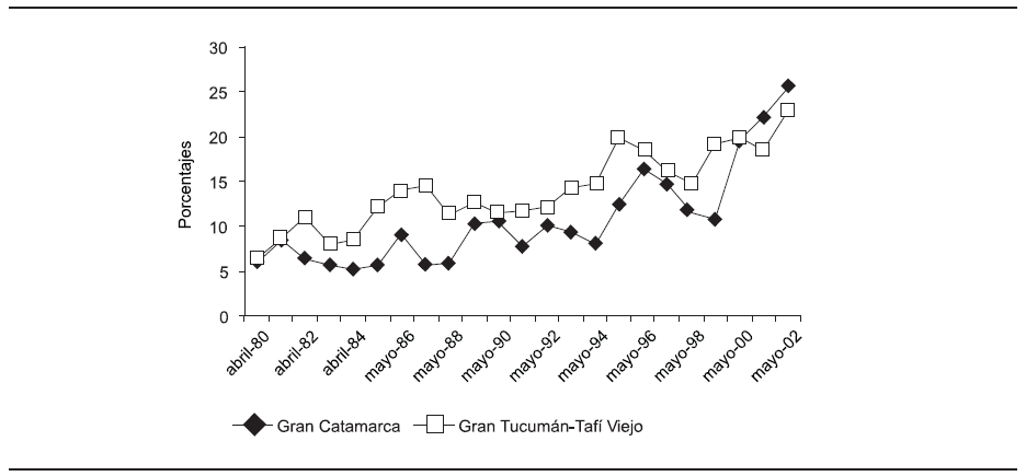 En este artículo nos proponemos analizar las características que presentó la pobreza en Catamarca y Tucumán en el periodo 1980-2002,4 y examinar su relación con los problemas de empleo que afectaron a sus poblaciones.