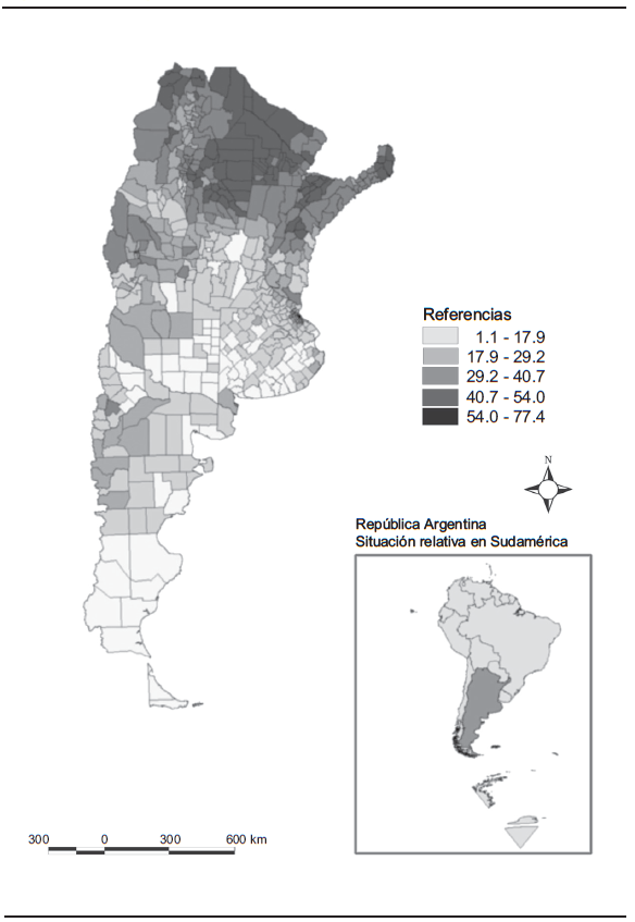 2La intensidad de la pobreza en el mapa 1 es medida por el Índice de Privación Material de los Hogares (IPMH), metodología que desarrolló el Instituto de Estadísticas y Censos de Argentina (INDEC) en 2001. Las características de este indicador se explican en el apartado referente a la metodología.