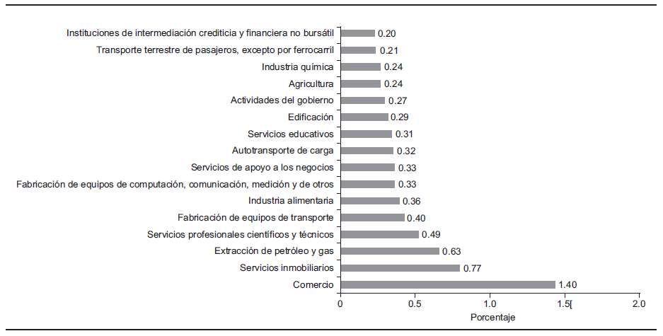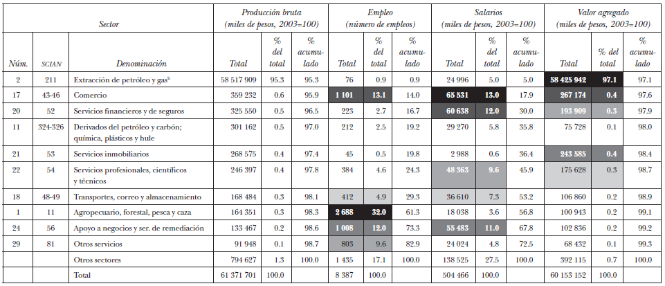 Entre las primeras diez aparecen seis del sector terciario. Éstas deben su presencia en el grupo a su elevada participación en el valor agregado total. Las cuatro restantes son del sector industrial. Además de la extracción de petróleo y gas, aparecen: la fabricación de equipo de transporte; la industria alimentaria; y la fabricación de equipo de computación, comunicación, medición y de otros equipos, componentes y accesorios electrónicos.