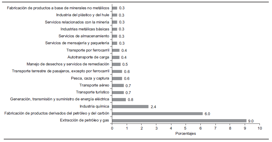 Los efectos más relevantes se observan en la misma actividad de extracción de petróleo y gas; la fabricación de productos derivados del petróleo y del carbón; la industria química; la generación, transmisión y suministro de energía eléctrica; el transporte turístico, aéreo, terrestre, autotransporte de carga, y por ferrocarril; la pesca, caza y captura; los servicios de mensajería y paquetería; los servicios de almacenamiento; las industrias metálicas básicas; los servicios relacionados con la minería; la industria del plástico y del hule, así como la fabricación de productos de minerales no metálicos.
