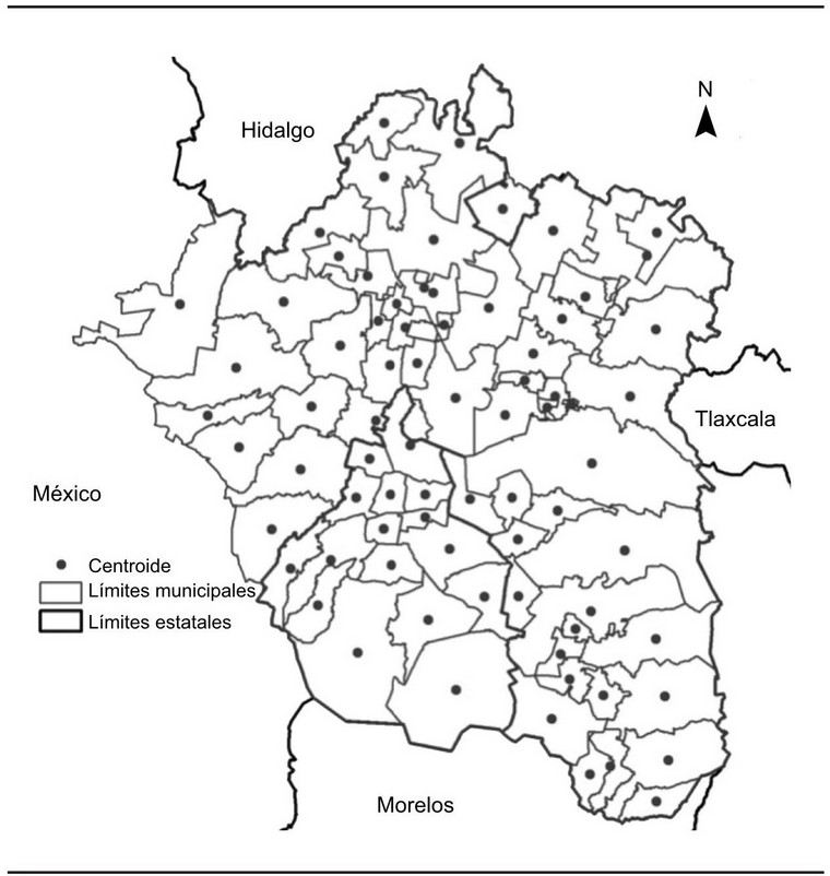 Administrativamente la ZMCM está conformada por 16 delegaciones del Distrito Federal, 59 municipios del Estado de México y uno de Hidalgo (9). Su representación territorial se muestra en el mapa 1.