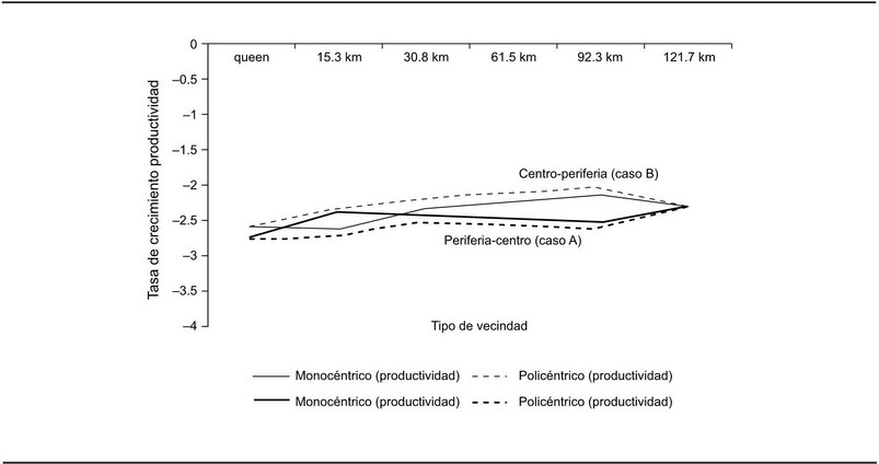 Cuando se considera el crecimiento de productividad del trabajo, en general la tasa de equilibrio es tanto mayor cuanto mayor es la distancia cuando el sistema arranca del centro a la periferia (efecto convergencia). Asimismo resalta que si el sistema arranca de la periferia al centro en el caso monocéntrico, la tasa de equilibrio prácticamente alcanza el máximo con una interacción local de 15 km, lo que sugiere que no es necesario que los municipios o delegaciones interactúen con todos para que alcancen una tasa de crecimiento aceptable bajo esta condición monocéntrica.