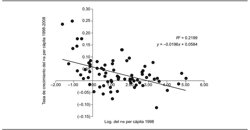 En el interior de la ZMCM el PIB de los municipios y delegaciones creció a una tasa promedio de 5.7% en el periodo 1998-2008; pero este promedio oculta la fuerte heterogeneidad de tal crecimiento entre las microrregiones, pues mientras las primeras cinco mayores tasas promediaron anualmente 20% (Isidro Fabela, Atlautla, Valle de Chalco, Jaltengo y Jilotzingo), las últimas cinco muestran un decrecimiento promedio anual de 4.1% (Cuautitlán, Azcapotzalco, Milpa Alta, Gustavo A. Madero y Tepetlaoxtoc). Las mayores tasas de crecimiento que se registraron en el periodo 1998-2008 coinciden con los municipios más pobres en 1998, de ahí que dichas regiones mejoraran notablemente su condición económica para el año 2008; esto se puede observar en la gráfica 1, donde se despliega el diagrama de dispersión entre el Log del PIB per cápita 1998 (en el eje de las X) y el crecimiento en el periodo 1998-2008 del Log del PIB per cápita.