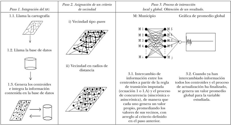 El proceso de simulación que se propone para estudiar las ecuaciones 1 y 1.A se sintetiza en tres pasos: 10 en el primero se integra el SIG a la interfaz del programa de simulación; en el segundo se asigna un criterio de vecindad (tipo queen o el criterio de radios de distancia), y en el tercero se ejecuta la regla de transición (ecuaciones 1 y 1.A). Debido a que estamos simulando la dinámica de ecuaciones discretas, la simulación calculará en cada instante de tiempo (tick) 11 una tasa de crecimiento individual y a su vez contabilizará un dato global, el cual expresará el crecimiento promedio de las regiones de la ZMCM (véase la ecuación 2). En el esquema 1 se describen visualmente los pasos de simulación mencionados.
