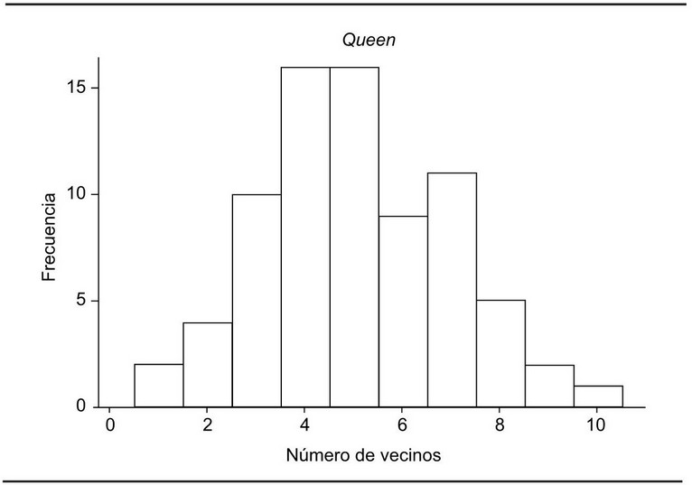 Para los ejercicios de simulación se construyeron dos estructuras espaciales de interacción. El primer tipo de vecindad lo denominamos queen y está definido como una matriz de pesos espaciales, tal como se expresa en la ecuación 1.A. En términos cartográficos, los vecinos con los cuales un polígono generará un vínculo de retroalimentación serán aquellos otros con los que comparta aristas y vértices. La gráfica 2 ilustra el histograma de frecuencias del número de vecinos que tiene cada municipio o delegación de la ZMCM conforme a un vecindario tipo queen. Según el histograma el número de vecinos bajo esta modalidad de interacción es heterogéneo, y en promedio cada municipio-delegación interactúa con cinco municipios. Los casos extremos son Ecatzingo y Nopaltepec, con sólo un vecino; y Texcoco, que por su posición geográfica relativa tiene 10 municipios vecinos.