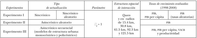 Finalmente, en el tercer experimento ejecutamos la simulación de manera asincrónica secuencial, calibramos con tasas de crecimiento del PIB, PIB per cápita, valor agregado censal bruto (VACB) y productividad (1998-2008). En un experimento con estas características el orden de actualización de los municipios se define a priori de acuerdo con algún criterio; en nuestro ejercicio definimos dicha actualización atendiendo a modelos de estructura urbana (monocéntrico y policéntrico). En los tres experimentos el parámetro de intensidad de interacción espacial es igual a 1.