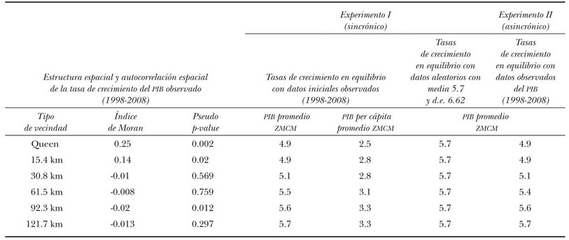 En la columna 4 del cuadro 4 se presenta la tasa de equilibrio promedio que se obtuvo con diferentes vecindades (véanse las hileras) cuando la condición inicial es la tasa de crecimiento promedio anual del PIB o la del PIB per cápita observadas en el periodo 1998-2008. Cabe advertir que la tasa de crecimiento promedio se incrementa con el criterio de vecindad, empezando con una tasa de 4.9 para el PIB y una tasa de 2.5 para el PIB per cápita, con una vecindad queen o de radio de 15.4 km, hasta alcanzar una tasa de crecimiento máxima de 5.7 y 3.3 respectivamente, con un radio de interacción de 121.7 km. Estas últimas tasas de equilibrio (5.7) y (3.3) coinciden con la tasa de crecimiento promedio inicial, pero ahora son una tasa de contagio o de convergencia ya que todos los municipios y delegaciones la “adoptan” cuando la ZMCM está en equilibrio. El mensaje de esta primera simulación indica que entre más local sea la interacción, menor será la tasa de convergencia o contagio respecto a la tasa de crecimiento global inicial. 15