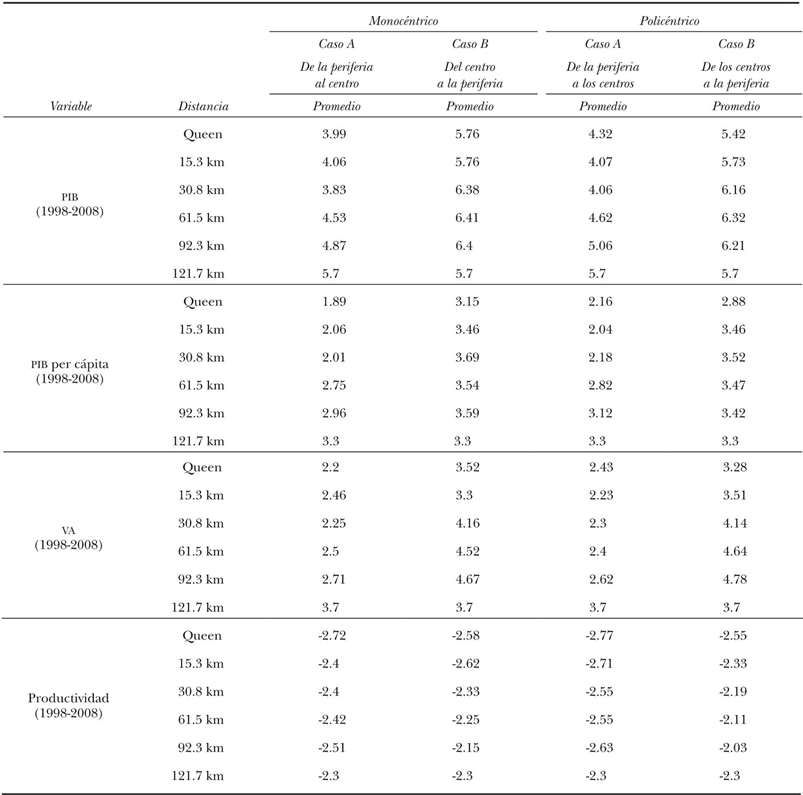 En el cuadro 5 se resumen los resultados que se obtuvieron para los criterios monocéntrico y policéntrico y sus respectivos casos A y B, y se presentan los promedios globales que resultaron al finalizar cada corrida. En las simulaciones estamos considerando ahora la tasa de crecimiento media anual (1998-2008) de cuatro variables (véase la columna 1 del cuadro 5): PIB, PIB per cápita, valor agregado censal bruto y productividad laboral.