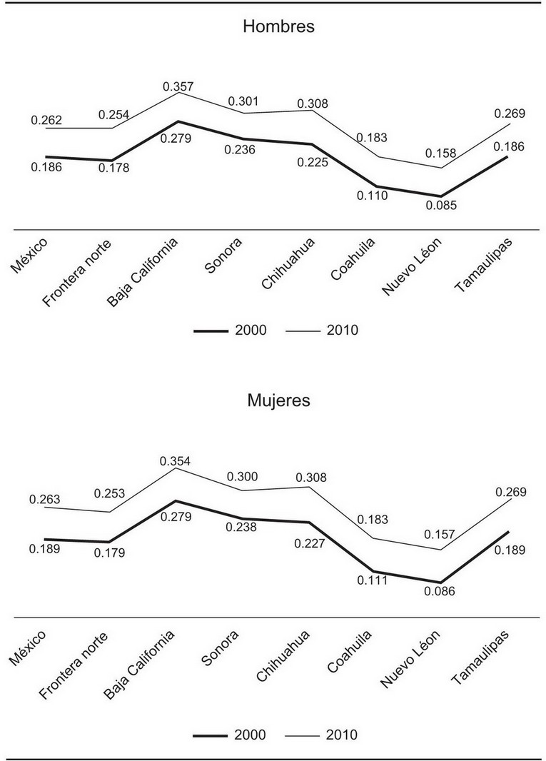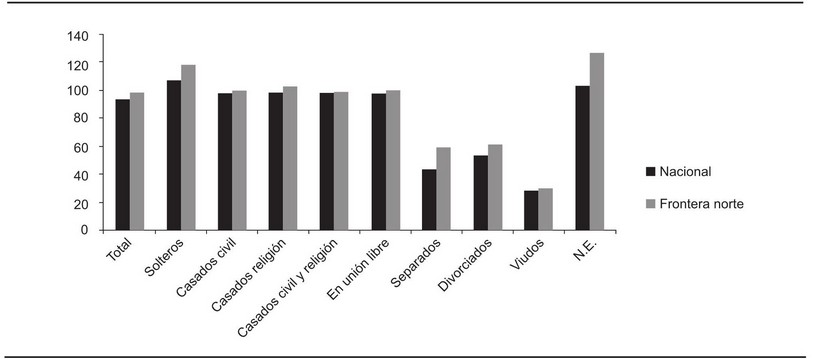 Si bien los índices de masculinidad aumentaron entre 2000 y 2010 en el conjunto nacional y en la frontera norte, fueron más altos en el norte tanto al principio como al final de la década. Esta situación imperó en todas las categorías de estado civil, con excepción de la población unida sólo religiosamente, pero en especial en la población soltera norteña, cuyos índices de masculinidad fueron de 117.4 y 118.2 en los años 2000 y 2010, respectivamente, en comparación con el país, en que tales índices fueron 106.5 y 107.4 para los mismos años. Asimismo llaman la atención los significativamente más altos índices de masculinidad en la población norteña con estado civil no especificado, que alcanzaron valores de 121.4 en el año 2000 y de 127.0 en el año 2010, a diferencia del país en su conjunto, que para los mismos años censales presentó valores de 110.3 y 103.8.