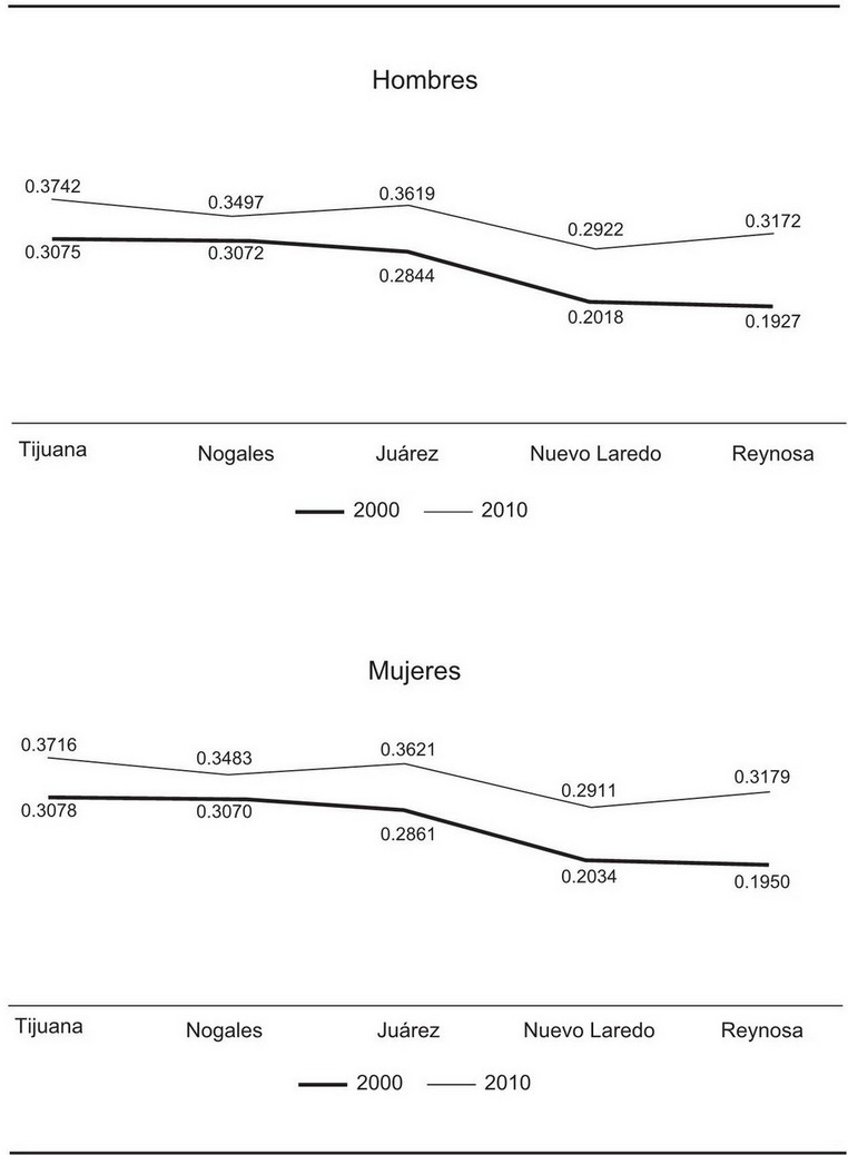 En segundo término se observa que si bien el aumento de las uniones libres entre 2000 y 2010 se dio en todos los estados y en todos los municipios fronterizos considerados, fue más pronunciado entre los municipios de la subregión este, donde se encuentran los estados que tienen los niveles menos altos de uniones libres. Nótese en la gráfica 2 que entre 2000 y 2010 se amplió la brecha entre los valores de los índices tanto para los hombres como para las mujeres residentes de los municipios de Juárez, Nuevo Laredo y Reynosa (situados al este) en comparación con lo que ocurrió en Tijuana y Nogales (ubicados al oeste). Esto resultó de una reducción más pronunciada de las diferencias entre el este y el oeste de los valores que adoptaron las proporciones de los municipios, que las de los estados fronterizos. Así por ejemplo, el porcentaje de uniones libres de la población masculina de Reynosa pasó de 19.3 a 31.7 durante la década y se ubicó por arriba de los niveles que tenían los municipios de Tijuana (30.8%) y Juárez (30.7%) diez años antes.