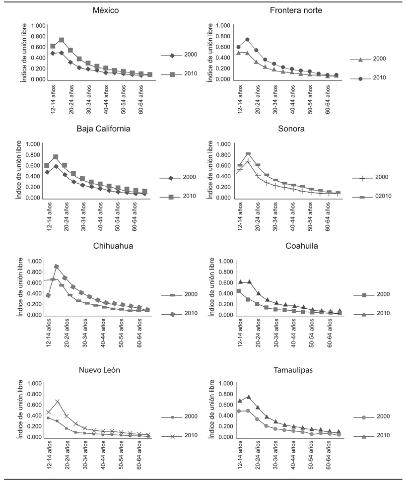 Finalmente importa mencionar que si bien Coahuila y Nuevo León mantienen las menores proporciones de uniones libres, dichas uniones parecen iniciarse a edades comparativamente menores, especialmente Coahuila, que las de otros estados norteños. Esta situación llama poderosamente la atención y nos invita a reflexionar al respecto y considerar la conveniencia de realizar investigaciones más detalladas sobre el tema que nos den la posibilidad de explicar, más allá del dato duro, la mayor precocidad de las uniones libres en los dos estados más conservadores de la región norte de México respecto a la estructura de sus arreglos conyugales.