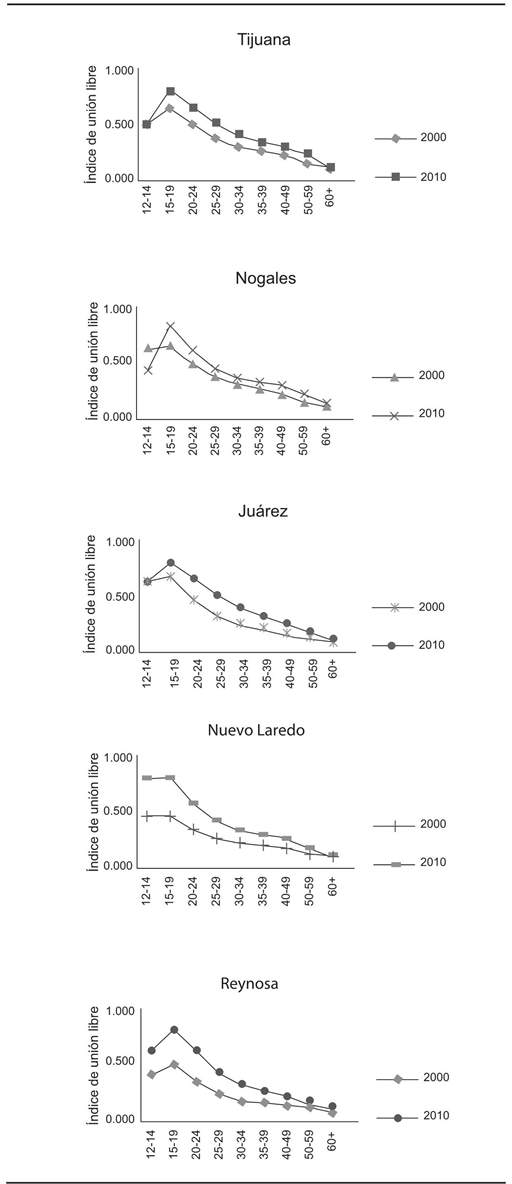 El patrón geográfico este-oeste arriba señalado en las proporciones de uniones libres y su aumento generalizado entre 2000 y 2010 en los estados de la región fronteriza norteña se reafirma al examinar la situación que presentan los principales municipios fronterizos: Tijuana, Baja California; Nogales, Sonora; Ciudad Juárez, Chihuahua; Nuevo Laredo y Reynosa, Tamaulipas. Se trata de los municipios con más población y con niveles económicos más altos, que además son colindantes territorialmente con Estados Unidos y tienen en contraparte una “ciudad gemela” estadunidense, a saber: San Diego, California, con Tijuana, Baja California; Nogales, Arizona, con Nogales, Sonora; El Paso, Texas, con Ciudad Juárez, Chihuahua; Laredo, Texas, con Nuevo Laredo, Tamaulipas, y Eagle Pass, Texas, con Reynosa, Tamaulipas.