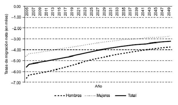 Como se mencionó, en las proyecciones poblacionales para 2001-2050 se supuso que la tasa de emigración sería constante a lo largo del horizonte proyectivo. Además, en las proyecciones "programáticas" las premisas sobre cada componente incorporan las metas establecidas en el PNP de un sexenio determinado, sin que ello implique que el gobierno mexicano adopte como meta de mediano o largo plazos la trayectoria predefinida para los años subsecuentes. Entonces, es posible concluir que el supuesto sobre la migración constante y, por ende de crecimiento económico de 5%, obedeció a una coyuntura político-económica ubicada al inicio del sexenio de Vicente Fox.