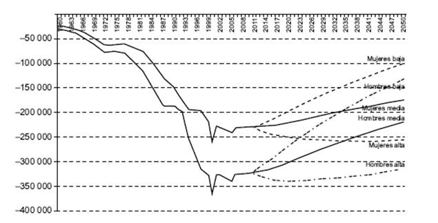 Para las proyecciones del periodo 2005-2050 se supusieron dos escenarios alternativos: en el primero las tasas de emigración de los mexicanos se mantendrían constantes hasta 2010 y después descenderían linealmente hasta llegar en 2050 a la mitad de los niveles observados en el quinquenio 2000-2005 y, en el segundo, se supuso que las tasas de emigración de mexicanos se mantendrían constantes hasta 2010 y después aumentarían hasta que fueran 50% superiores. Además se incorporó el supuesto de que las tasas de migración de retorno de mexicanos y de migración neta hacia el resto del mundo se mantendrían invariables a lo largo de la proyección. Para las proyecciones del periodo 2000-2050 sólo se supuso un escenario alternativo: tasas de emigración de mexicanos constantes hasta 2010 y después en descenso lineal hasta llegar en 2050 a la mitad de los niveles observados en el periodo 1995-2000. También se supuso que las tasas de migración de retorno y de migración neta de la población extranjera se mantendrían invariables a lo largo de la proyección.