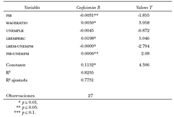 Así, se observa que el signo asociado a la variable de desempleo no opera en la dirección esperada; es decir, por cada unidad que se incrementa la tasa de desempleo la emigración disminuye. Es por ello que cuando los autores introducen variables colineales (las variables de interacción), la vuelven no significativa y, de esta manera, se encuentra el sentido deseado. Estrictamente, tampoco debería incluirse la variable PIB si se considera un nivel de significancia de 0.05 ya que debe estar explicada en cierta medida por la variable PIB-UNEMPLR. Sin embargo, no fue eliminada del modelo porque dejaría de hacer directamente observable el efecto del crecimiento económico en la emigración acumulada.
