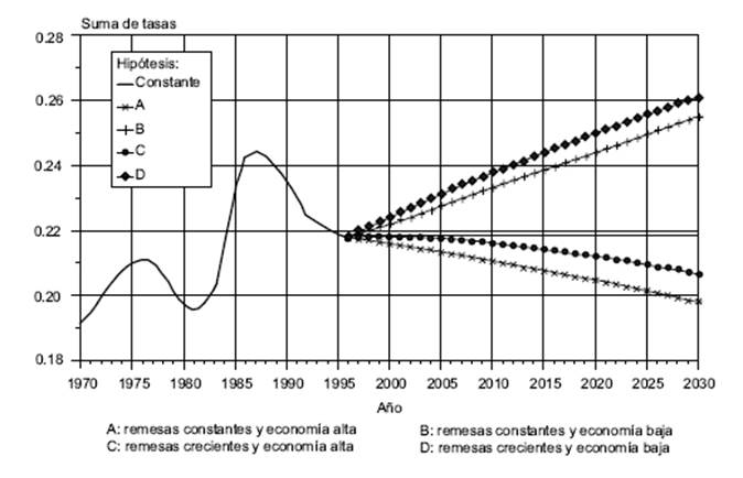 Ahora bien, respecto a las simulaciones de escenarios alternativos de desarrollo se supuso que: 1) el nuevo modelo económico sería estimulado por el TLC y podría retomar la senda de crecimiento alto y sostenido, como el observado durante 1954-1970; a este escenario se le denominó de "economía alta"; 2) en el segundo escenario, denominado "economía baja", se supuso un desempeño económico errático como el observado desde 1985. Cada escenario fue combinado con dos hipótesis sobre el comportamiento futuro de las remesas: a) el monto de las remesas se mantiene constante a partir de 1996; b) el monto de las remesas se incrementa de acuerdo con una función logística.4 Un último escenario, utilizado como referencia, es calculado manteniendo constantes las tasas de emigración estimadas para 1996.