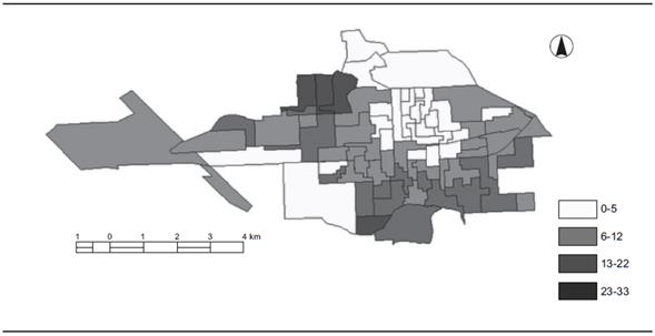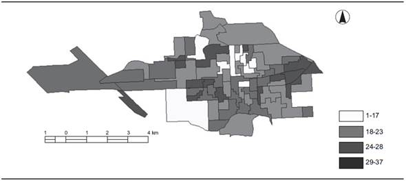 En el caso del tercer indicador seleccionado distinguimos una distribución espacial que combina ambos patrones: la proporción de la población que residía en viviendas en donde habitaban por lo menos seis personas (Mapa 3). Los puntajes más elevados que obtuvimos conforme a este atributo, que constituye una aproximación a la cantidad de personas por cuarto, se localizan en los asentamientos periféricos que hicieron su irrupción hacia fines de los setenta, entre los cuales se destacaba la franja de "villas de emergencia" situadas al norte del tradicional barrio "Progreso" (en el noroeste de la ciudad). Al mismo tiempo, y como es lógico imaginar, la problemática de la cohabitación abarcaba algunos de los radios censales en donde dos o más generaciones residían en una misma vivienda (por caso: el barrio "Bouquet Roldan" en el oeste de la trama urbana). Por último aparecen áreas que durante buena muchos años del siglo XX formaron parte de las colonias agrícolas que impulsaron la fruticultura neuquina, pero cuyo perfil hacia comienzos de la década de los ochenta estuvo cada vez menos asociado al sector primario de la economía. En ese casillero debemos ubicar algunos radios censales que corresponden a la "Colonia Confluencia" en el este de la ciudad, donde, en palabras de un geógrafo, "las altas densidades de población concentradas en viviendas exiguas se suman a los problemas sociales ahí presentes" (Albers, 1995: 93).